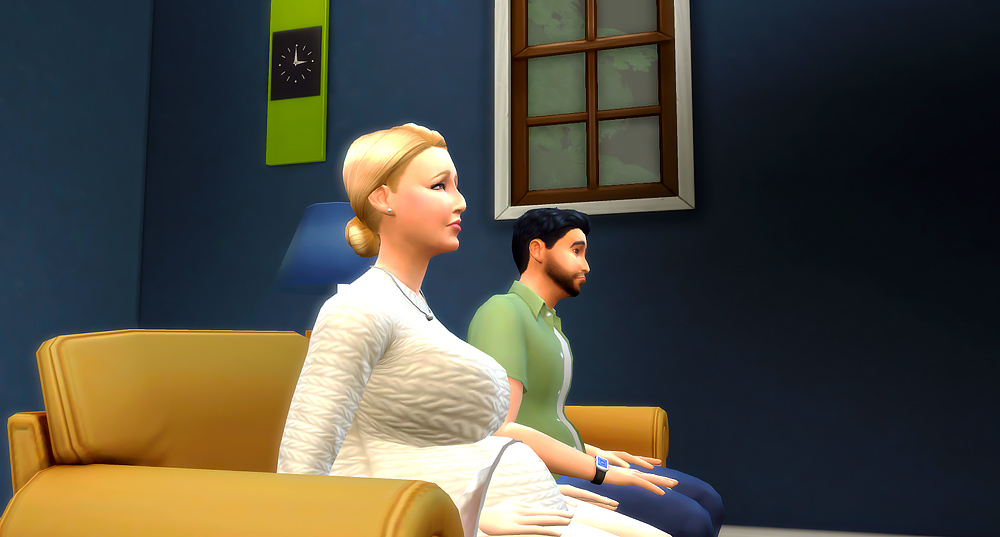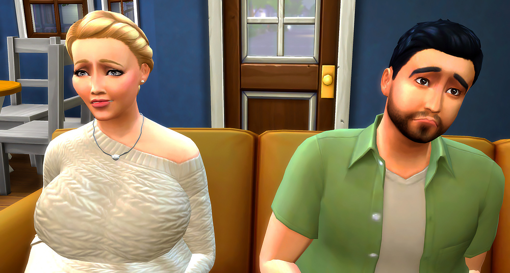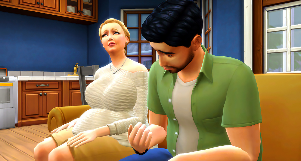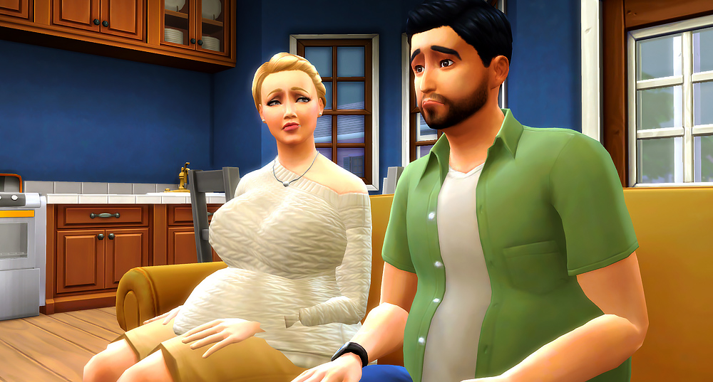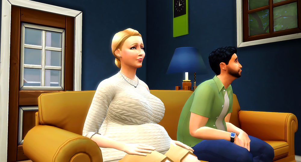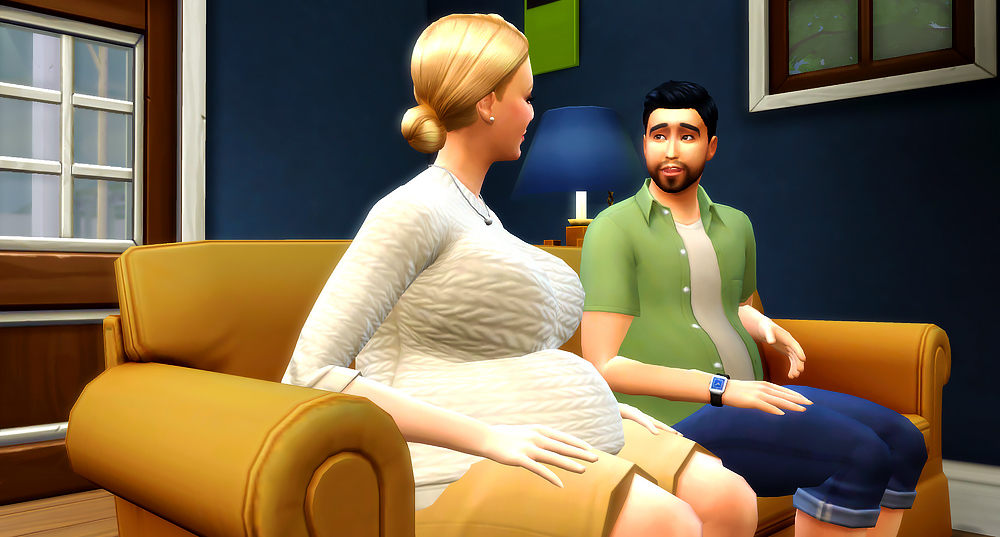 She attempted to pry herself off his low sofa. She always had trouble getting up, but especially now with their bun in the oven.